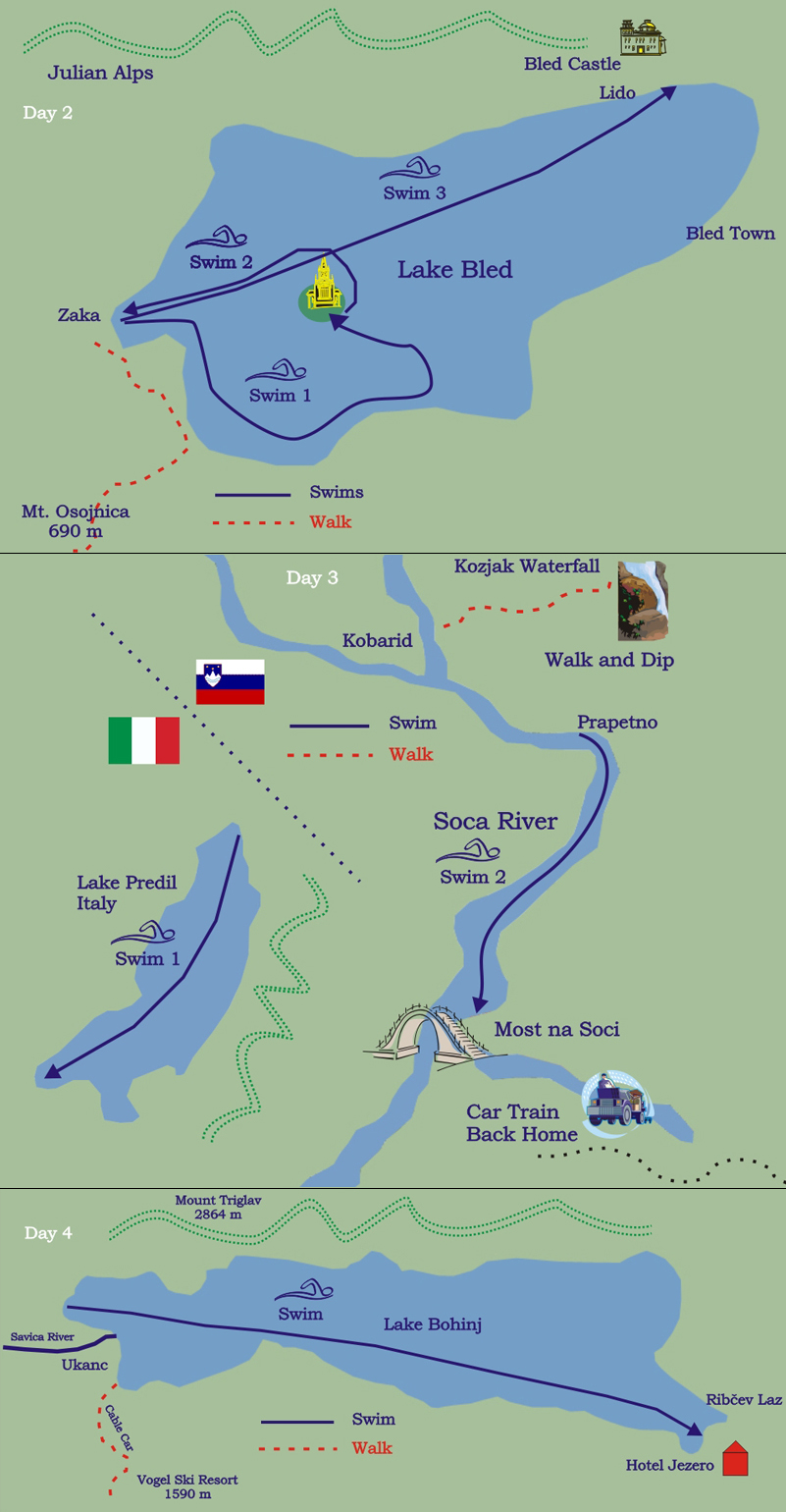 Unsere Basis ist das kleine und abgelegene Dorf Bohinj am Rande des berühmten, gleichnamigen Sees. Bohinj ist der perfekte Ausgangsort, um die fantastische Landschaft der Gegend zu erkunden. Jeder Tag unserer Tour beinhaltet abwechselnde Schwimmstrecken und Spaziergänge, so dass unsere Gäste einen erleben können, was Sloweniens Landesinnere zu bieten haben.